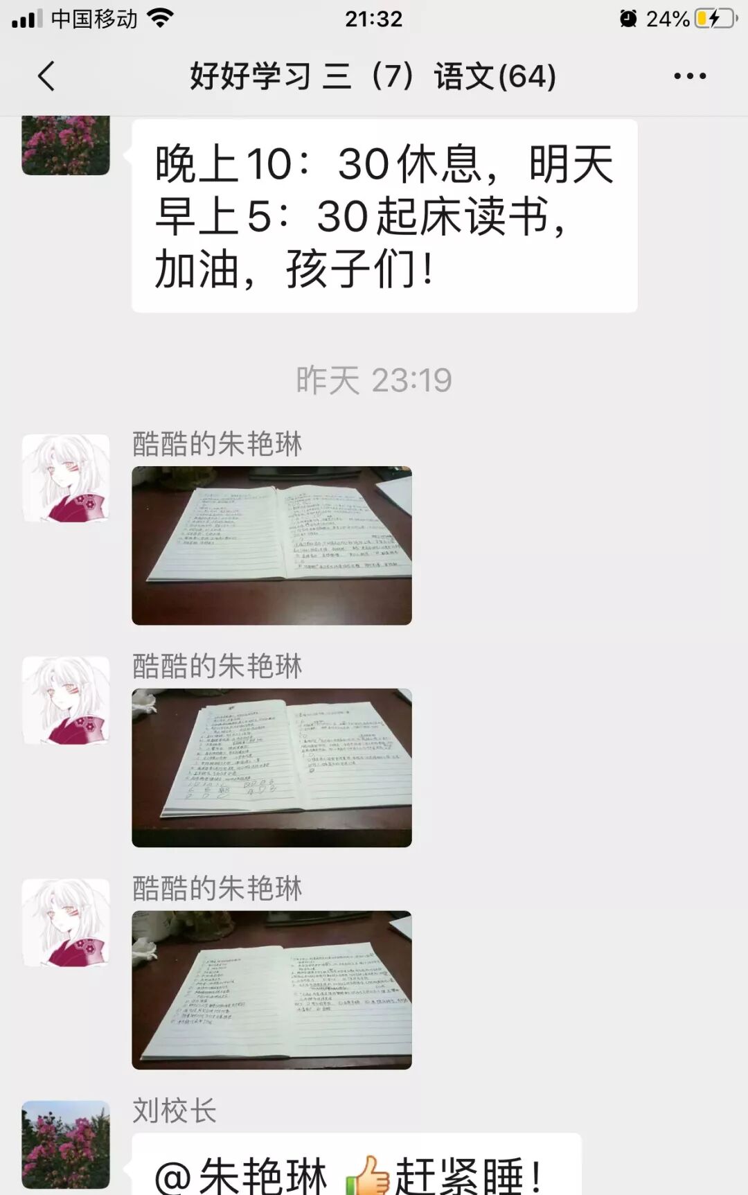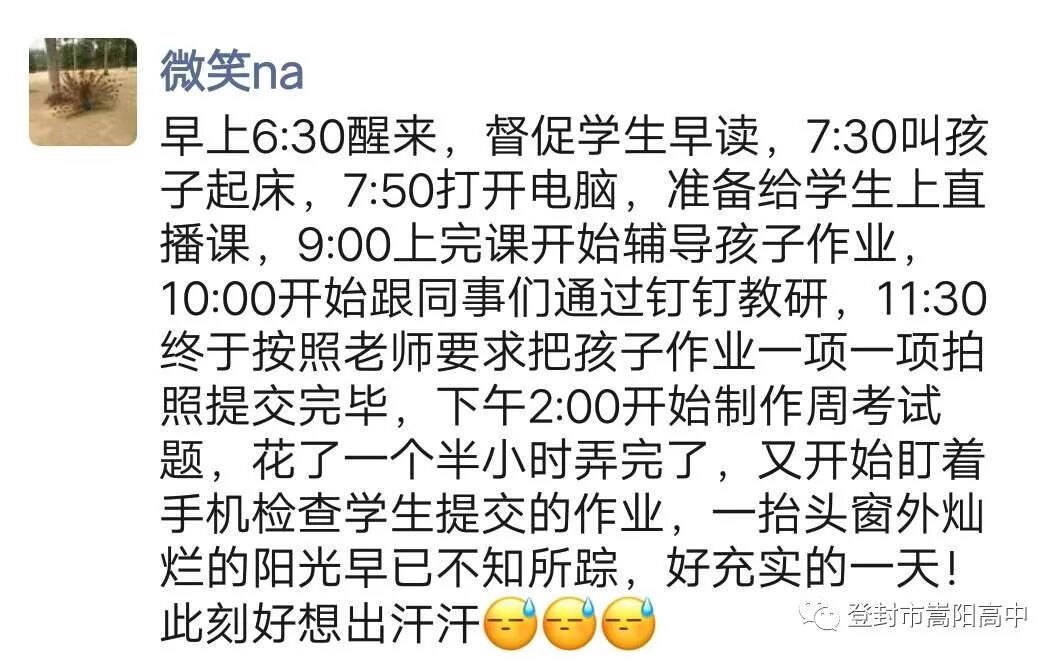 除了班主任召开的主题班会,老师们的鼓励也无处不在:“亲们,孩子们,各位小主!虽不清楚还要耽误多少时间,为了20届高考,我们真该玩儿命了,无天时无地利,还不和老师一起拼,还等什么!!!”刘校长落实早读,一丝不苟、指出错误,一个不放过、批改试卷,用心良苦;王晓玲老师凌晨3:24分改完试卷,发了成绩,总结了存在的问题;何淑艳、董英英、刘建军老师批改每份试卷、写走心的批语、上有效的课。秦小玲老师每天中午12:30利用钉钉群给学生开直播,张素娜老师把每一个题利用小视频非常详细地给学生解答,孙秋云老师、赵争艳老师每天上直播、单独给无数个学生辅导,很多时候都忙到深夜。疫情隔开了师生的距离,但拉近了师生的心。